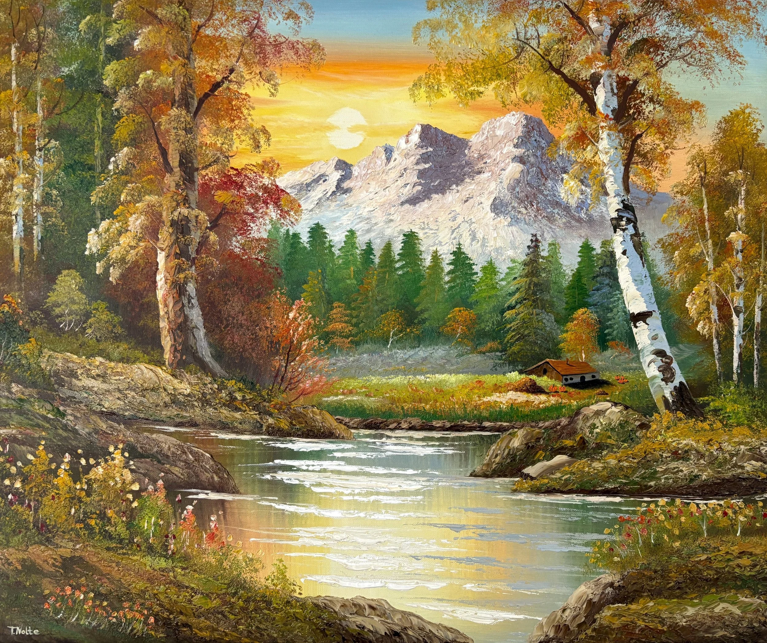 It captures the quiet warmth of fall. A small cabin surrounded by red and yellow leaves, a calm lake in the middle, and evergreen trees standing tall like silent guardians. Pumpkins and piles of leaves around the cabin mark the season and symbolize comfort, harvest, and home. A soft breath before the cold.